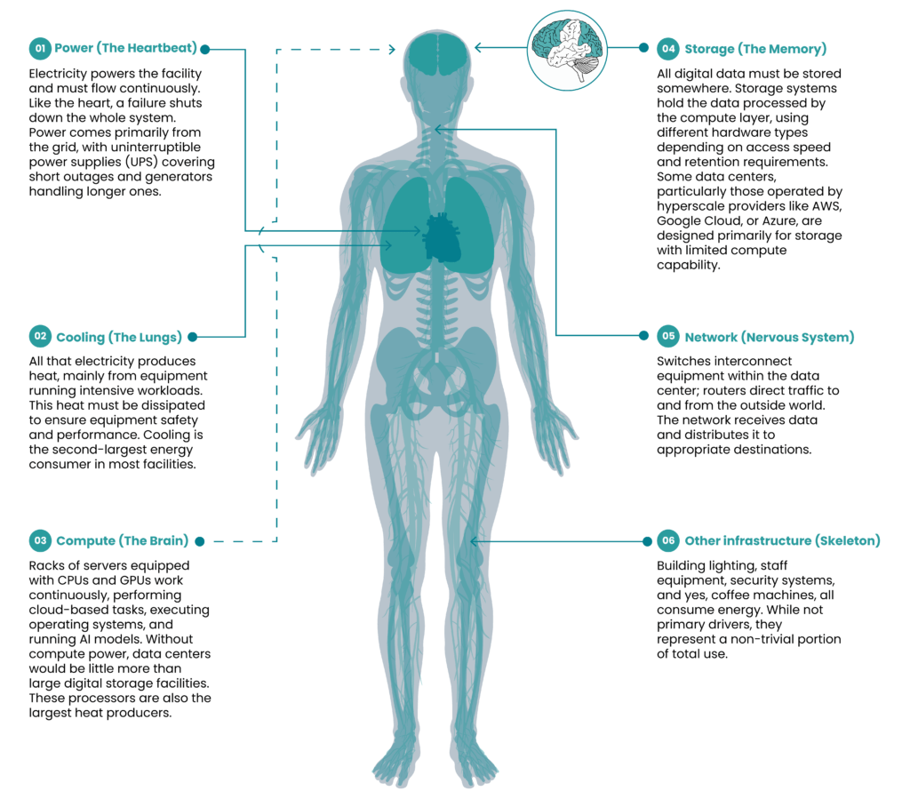 To understand how to optimize energy efficiency, you first need to understand what consumes the energy. A useful analogy, offered by Global Data Center Hub (2025), compares a data center to human physiology: