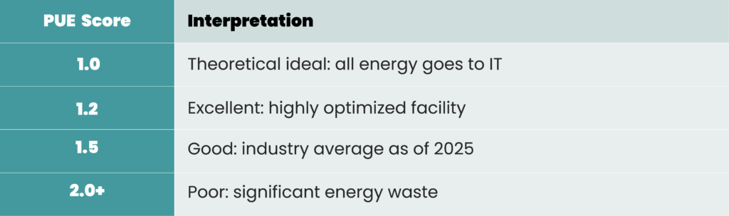 A perfect PUE of 1.0 means every watt feeds directly into IT equipment. Higher values indicate more energy lost to cooling and infrastructure overhead.