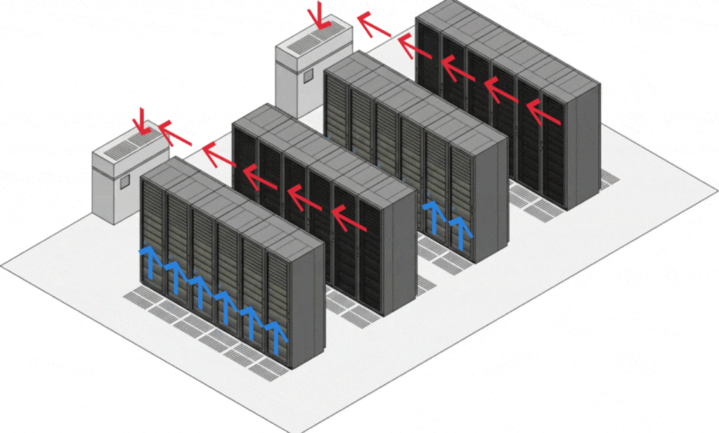 Hot/Cold Aisle Containment: A layout improvement that physically separates equipment racks into alternating rows. The cold aisle supplies cool air to the front of equipment; heat exhausts through the rear into the hot aisle, where it is extracted. This prevents mixing and improves efficiency without changing cooling technology.