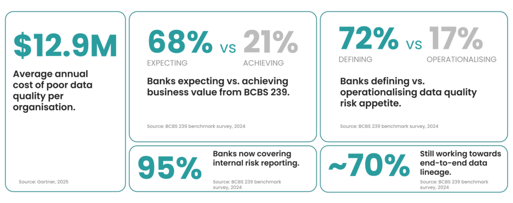 Frameworks such as BCBS 239, focused on risk data aggregation and risk reporting, have fundamentally reshaped how large financial institutions organise their data, define ownership, and control quality.