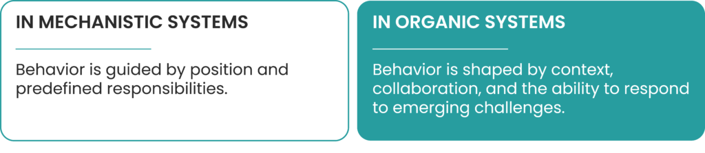 Burns and Stalker contrasted mechanistic systems with what they called organic systems: structures designed for change rather than stability. In these organizations, roles are more fluid, authority is distributed, and coordination relies less on hierarchy and more on expertise and interaction.