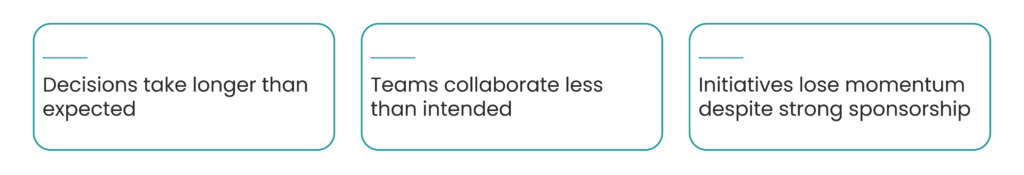 Individually, these symptoms may appear operational. Collectively, they point to something deeper: a growing gap between what the organization is trying to become and how it is actually designed to operate.