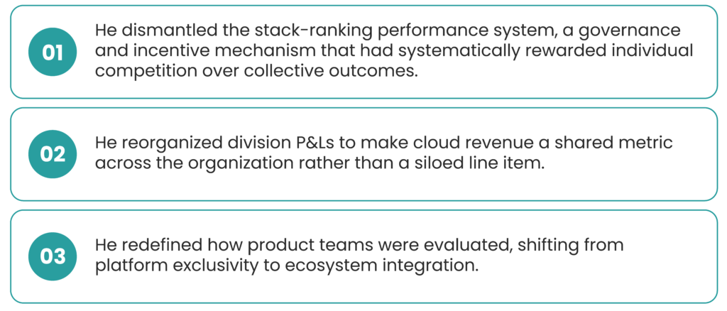 These were not cultural initiatives. They were structural interventions (changes to governance, incentives, roles, and processes) that made collaboration the path of least resistance rather than the exception. The cultural shift Nadella described as “growth mindset” was real and important. But it was the structural redesign that made it durable.