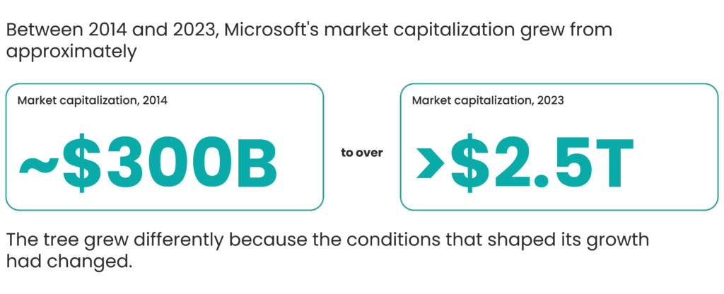 Few cases illustrate this more clearly than Microsoft’s transformation under Satya Nadella, who became CEO in 2014. When Nadella took over, Microsoft was widely described as a company in strategic drift, organized around competing product divisions, governed by a stack-ranking system that pitted employees against one another, and culturally resistant to the kind of cross-platform collaboration its cloud ambitions demanded. The cultural diagnosis was clear. But Nadella’s response was structural.