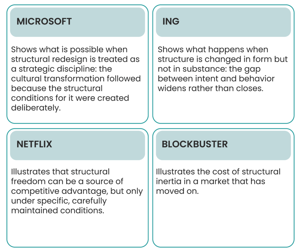 What makes the ING case particularly instructive, however, is what happened when other markets attempted to replicate it. Several country organizations copied the organizational structure (the squads, the tribes, the language) without changing the underlying governance or incentive systems. Decision rights remained centralized. Performance management continued to reward functional silos. The new structure existed on paper; the old structure continued to govern behavior in practice. The outcome was the worst of both worlds: the complexity of a new design without the benefits of genuinely distributed ownership. ING’s experience makes the mechanism of structural misalignment unusually transparent: it is not the org chart that drives behavior, it is the governance, incentives, and accountability systems underneath it. Change the chart without changing those, and the chart is irrelevant.