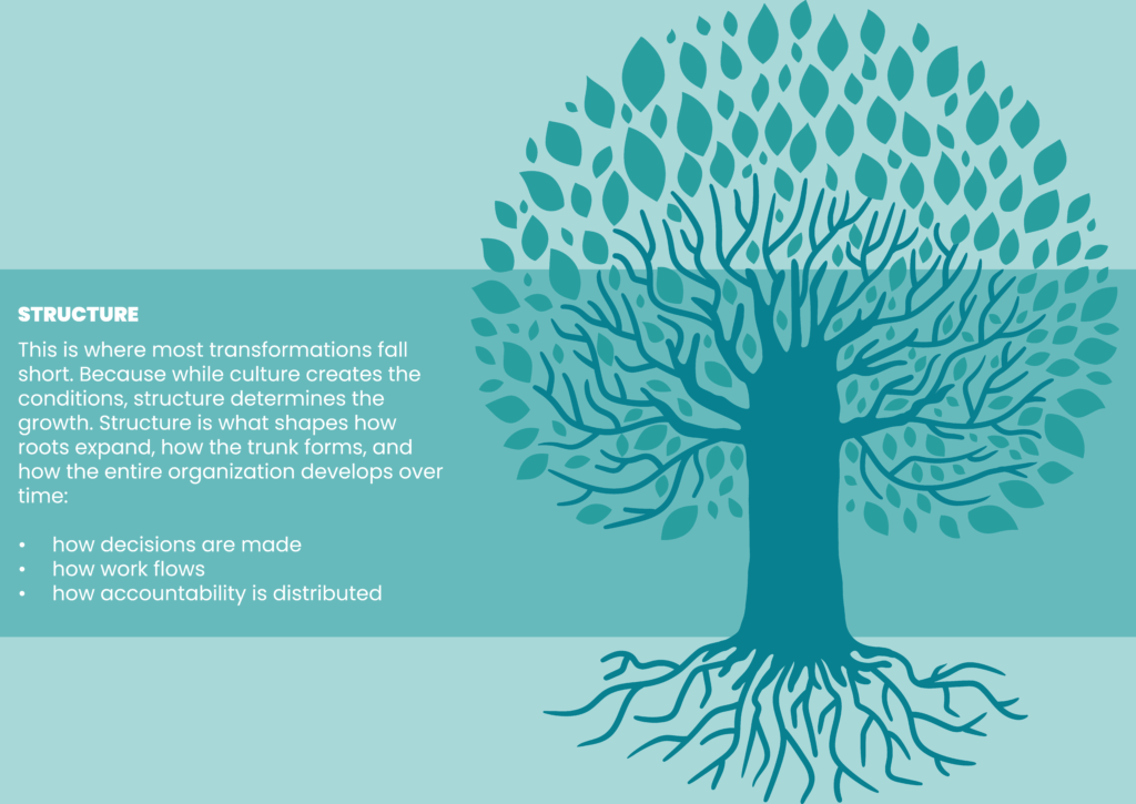 The result is a growing misalignment between what the organization needs and how it is built. The soil has been enriched over time, but the roots are constrained by an outdated structure that prevents them from growing properly. Organizations try to grow collaboration, agility, and innovation, yet the underlying system continues to reinforce control, predictability, and specialization. The tree is expected to grow differently, but the conditions that shape its growth remain unchanged.