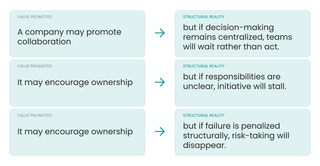 Over time, these patterns become predictable. Not because people resist change, but because the system makes certain behaviors easier than others. Values provide a clear indication of where an organization wants to go and structure determines whether it can get there.