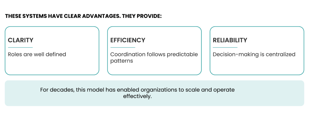 Most structures in place today were not built for the environment organizations now operate in. They were designed for a different context, one defined by relative stability, predictability, and efficiency.