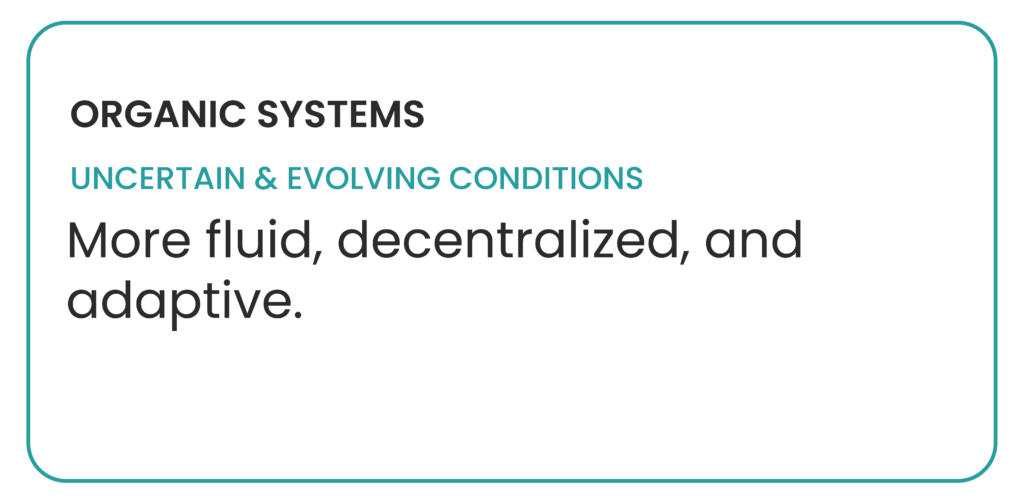 In more uncertain and evolving environments, organic systems emerge: