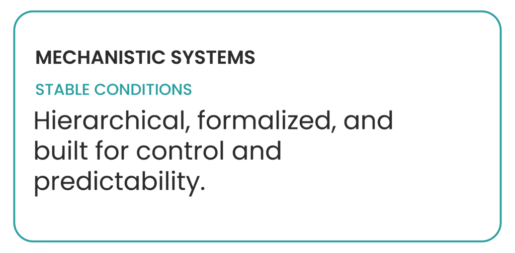 This is precisely what Burns and Stalker observed in their seminal work on organizational design. They showed that structures are not inherently good or bad, but that their effectiveness depends on the environment in which they operate. In stable conditions, organizations tend to rely on what they described as mechanistic systems: hierarchical, clearly defined, and optimized for control and consistency.