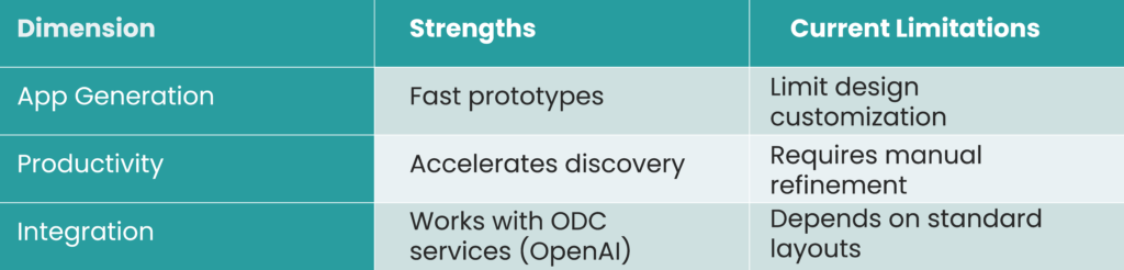 That said, limitations remain. AI-generated applications currently rely on standard OutSystems layouts, which constrains design flexibility. Custom UI/UX and advanced interaction patterns still require manual refinement. The value, however, lies not in replacing developers, but in compressing the path from concept to validated solution.