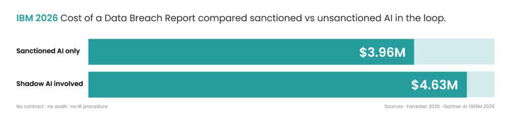Unsanctioned AI adds about $670K to the average breach cost, per IBM’s 2026 Cost of a Data Breach Report. These tools have no contract in place, no audit trail, and no incident response procedure, so recovery and disclosure costs balloon.