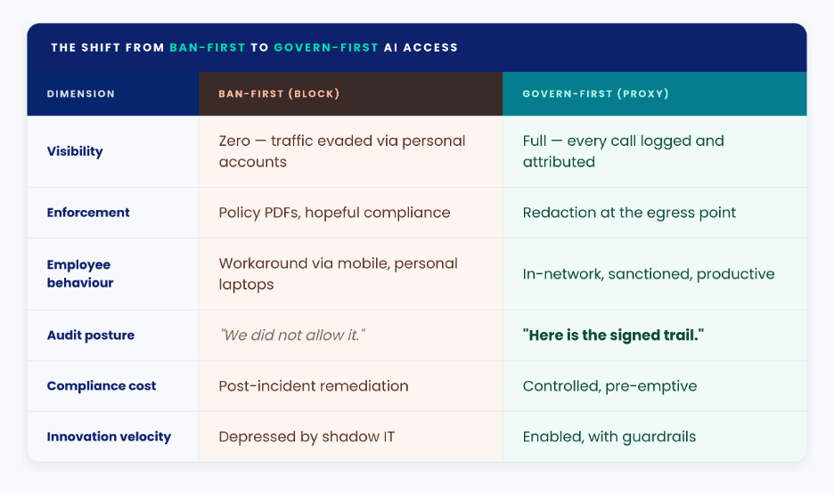 The first reflex has been to block. Add openai.com to the deny list. Push out a policy memo. Run DLP on outbound HTTPS. It has not worked.