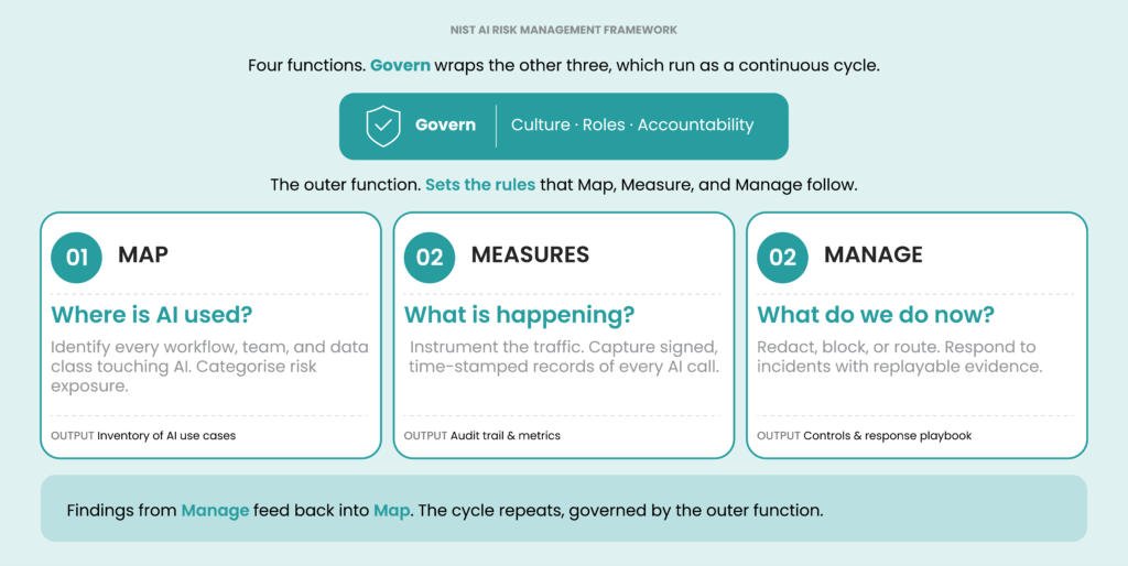 This matches the survey data. Forrester’s State of AI Security 2026 reports that 91% of organisations discover AI agent activity only after the fact. Most have policy on file; what they don’t have is a way to test it. Incident response on AI traffic needs the same primitives any other service needs: signed events, time-stamps, replayable logs.