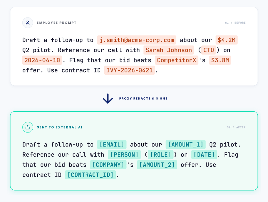 That proxy enforces policy before anything leaves the network. It scans for sensitive data, redacts it before it leaves the network, and ensures only approved models and use cases are permitted.
