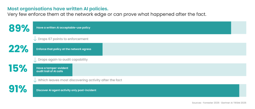 Most organisations have written AI policies. Few can answer basic operational questions when something goes wrong. Which teams used which models last week. What data left the network through those calls. What decisions did AI agents take on the organisation’s behalf.